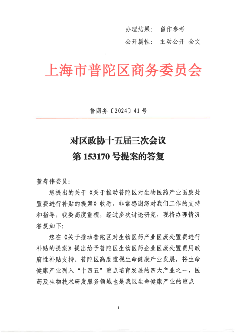 您在《关于推动普陀区对生物医药产业医废处置费进行补贴的提案》提出给予普陀区生物医药企业医废处置费用政府性补贴支持。普陀区高度重视生命健康产业发展,将生命健康产业列入“十四五”重点培育发展的四大产业之一,医药及生物技术研发服务领域也是我区生命健康产业的重点发展方向,您的提案对于推进生物医药领域高质量发展具有很好的借鉴意义。