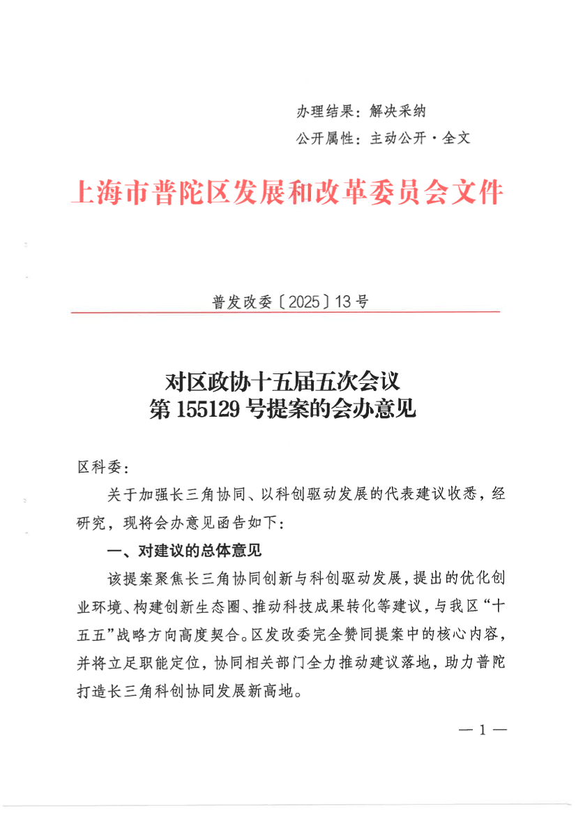 该提案聚焦长三角协同创新与科创驱动发展,提出的优化创业环境、构建创新生态圈、推动科技成果转化等建议,与我区“十五五”战略方向高度契合。区发改委完全赞同提案中的核心内容,并将立足职能定位,协同相关部门全力推动建议落地,助力普陀打造长三角科创协同发展新高地。