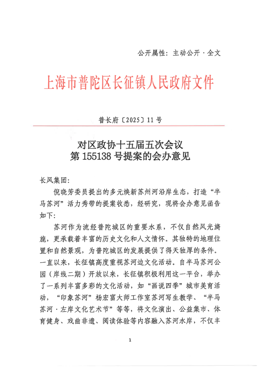 倪晓芳委员提出的多元焕新苏州河沿岸生态,打造“半马苏河”活力秀带的提案收悉,经研究,现将会办意见函告如下: