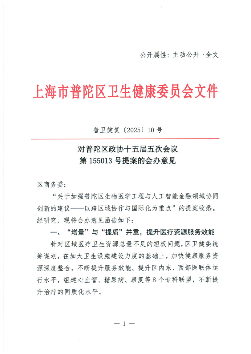 “关于加强普陀区生物医学工程与人工智能金融领域协同创新的建议——以跨区域协作与国际化为重点”的提案收悉。经研究,现将会办意见函告如下: