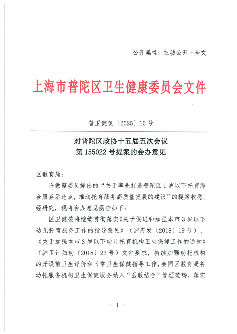 许敏霞委员提出的“关于率先打造普陀区1岁以下托育综合服务示范点,推动托育服务高质量发展的建议”的提案收悉。经研究,现将会办意见函告如下: