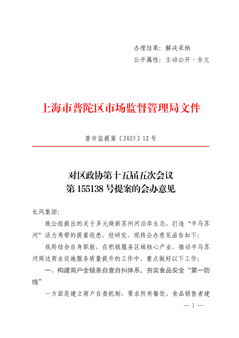 致公组提出的关于多元焕新苏州河沿岸生态,打造“半马苏河”活力秀带的提案收悉,经研究,现将会办意见函告如下: