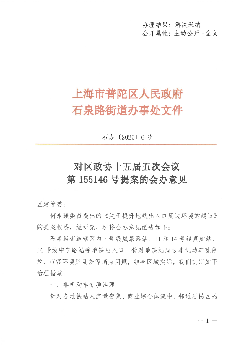 何永强委员提出的《关于提升地铁出入口周边环境的建议》的提案收悉,经研究,现将会办意见函告如下: