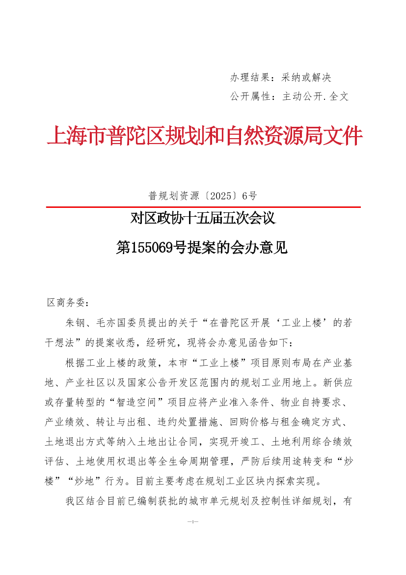 朱钢、毛亦国委员提出的关于“在普陀区开展‘工业上楼’的若干想法”的提案收悉,经研究,现将会办意见函告如下: