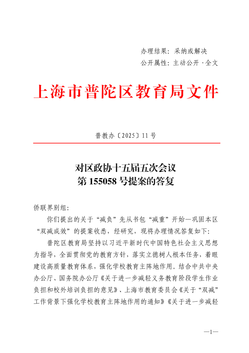 你们提出的关于“减负”先从书包“减重”开始—巩固本区 “双减成效”的提案收悉,经研究,现将办理情况答复如下:
