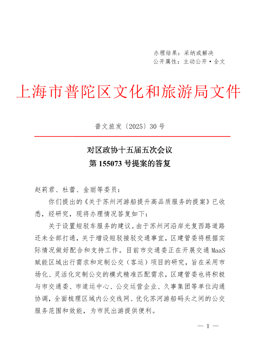 你们提出的《关于苏州河游船提升高品质服务的提案》已收悉,经研究,现将办理情况答复如下: