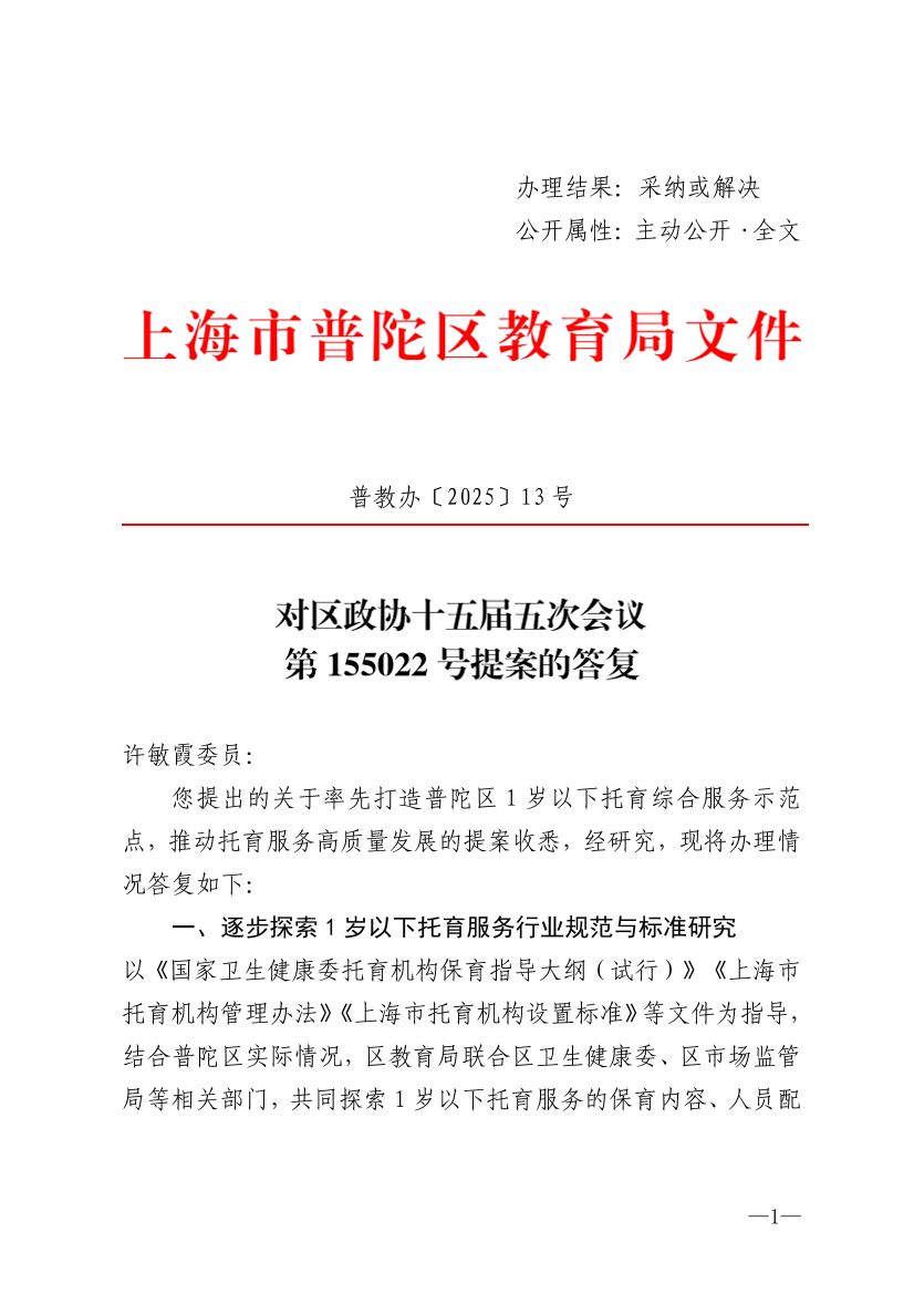 您提出的关于率先打造普陀区1岁以下托育综合服务示范点,推动托育服务高质量发展的提案收悉,经研究,现将办理情况答复如下: