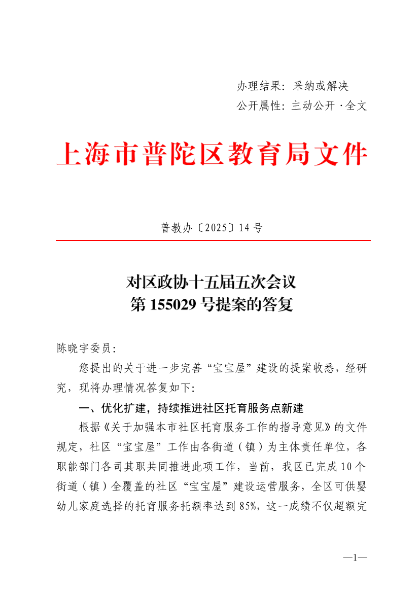 根据《关于加强本市社区托育服务工作的指导意见》的文件规定,社区“宝宝屋”工作由各街道(镇)为主体责任单位,各职能部门各司其职共同推进此项工作,当前,我区已完成10个街道(镇)全覆盖的社区“宝宝屋”建设运营服务,全区可供婴幼儿家庭选择的托育服务托额率达到85%,这一成绩不仅超额完成了市(区)年度工作指标,而且与上海市整体提升托育服务覆盖率和质量的目标保持一致。2025年,我区将继续把社区托育服务列为区“为民办实事”的民心工程项目之一,继续推进各街道(镇)社区“宝宝屋”的新建、改建工程,完成12家宝宝屋扩优提质,并列入区政府年度工作考核指标。