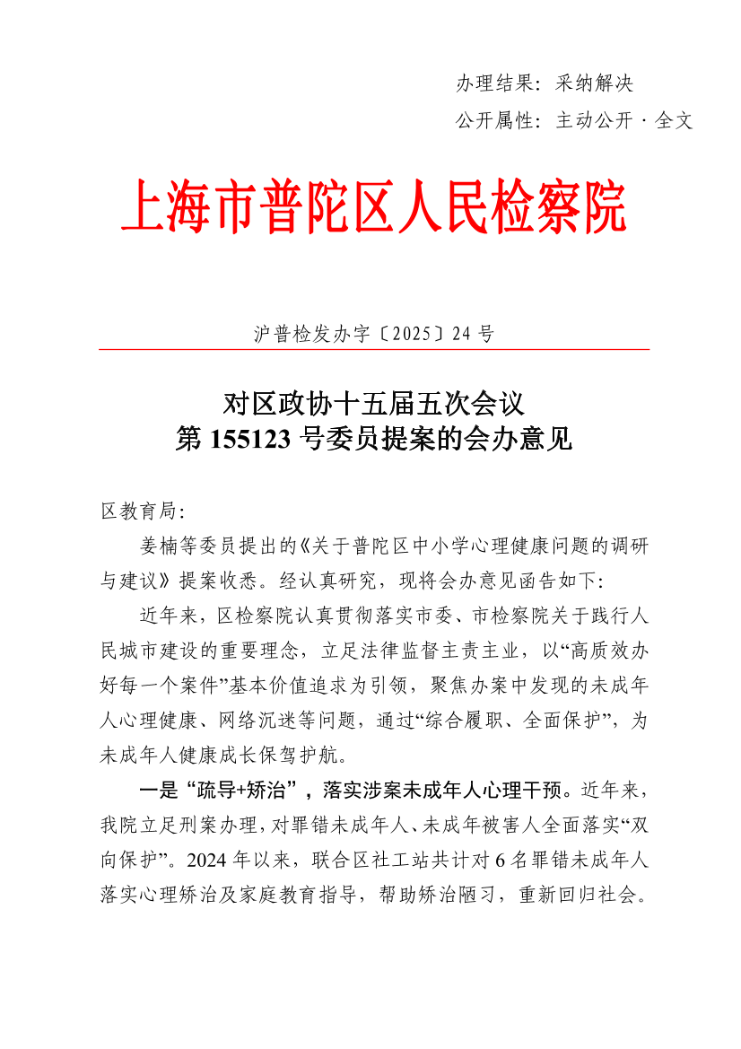 姜楠等委员提出的《关于普陀区中小学心理健康问题的调研与建议》提案收悉。经认真研究,现将会办意见函告如下: