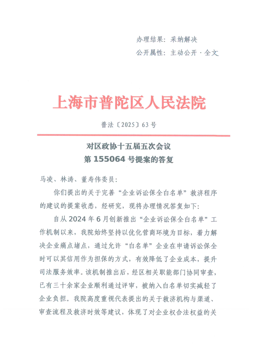 自从2024年6月创新推出“企业诉讼保全白名单”工作机制以来,我院始终坚持以优化营商环境为目标,着力解决企业痛点堵点,通过允许“白名单”企业在申请诉讼保全时可以其信用作为担保的方式,有效降低了企业成本,提升司法服务效率。该机制推出后,经区相关职能部门协同审查,已有三十余家企业顺利通过评审,被纳入白名单切实减轻了企业负担。我院高度重视代表提出的关于救济机构与渠道、审查流程及救济时效等建议,体现了对企业权合法权益的关切,我院正结合工作实际、对入库企业的审查流程等,并依托区相关职能部门对名单的准入及退出等做进一步的动态管理,并继续健全完善白名单管理机构,探索更加科学规范的救济渠道,确保审查程序公开透明、救济渠道畅通有效。同时,我院也将持续优化营商环境服务举措,强化与企业的沟通交流,让更多符合条件的企业享受到司法便民利企的政策红利,为构建更加优质的法治化营商环境贡献司法力量。