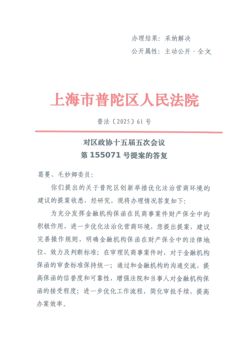 你们提出的关于普陀区创新举措优化法治营商环境的建议的提案收悉,经研究,现将办理情况答复如下: