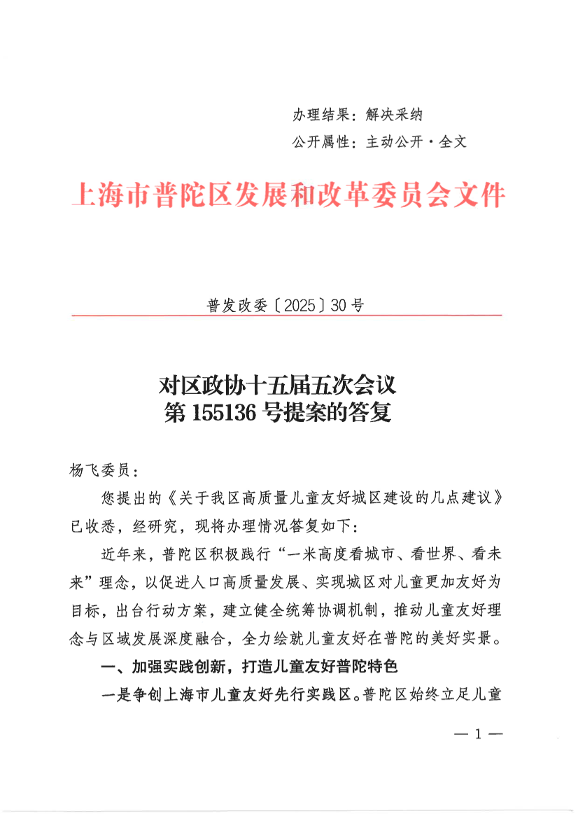 非常感谢您的建议,儿童的发展决定祖国的未来,我区将持续深化普陀区儿童友好城区建设工作,全面提高广大儿童的获得感、幸福感、安全感。希望您在今后的工作中,继续给我们提出更多意见和建议。谢谢!