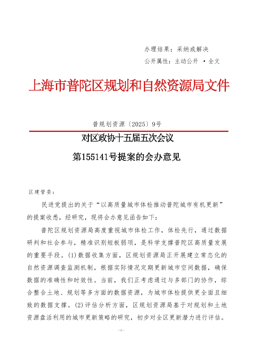 民进党提出的关于“以高质量城市体检推动普陀城市有机更新”的提案收悉,经研究,现将会办意见函告如下: