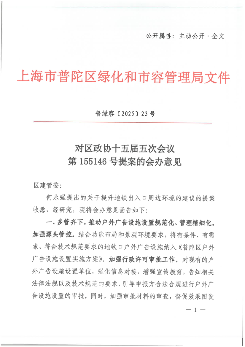 一、多管齐下,推动户外广告设施设置规范化、管理精细化。加强源头管控。结合功能布局和景观环境要求,将有条件、有需求、符合技术规范要求的地铁口户外广告设施纳入《普陀区户外广告设施设置实施方案》。加强行政许可审批工作。对现有的户外广告设施设置单位,强化信息对接,增强宣传教育,告知相关法律法规以及技术规范的要求,引导申报方合法合规进行户外广告设施设置的审批。同时,加强审批材料的审查,督促效果图设计与周边景观风貌相协调。深化监督管理工作。建立日常监管机制,督促设置方开展设施安全自查,及时更换破损、褪色的广告画面。加强巡查,强化管执联动。对发现的违规设置和存在安全隐患的广告设施,开具整改告知书,同时移送城管执法部门,形成“发现-整改-复查”的工作闭环,提升户外广告设施设置管理效能。