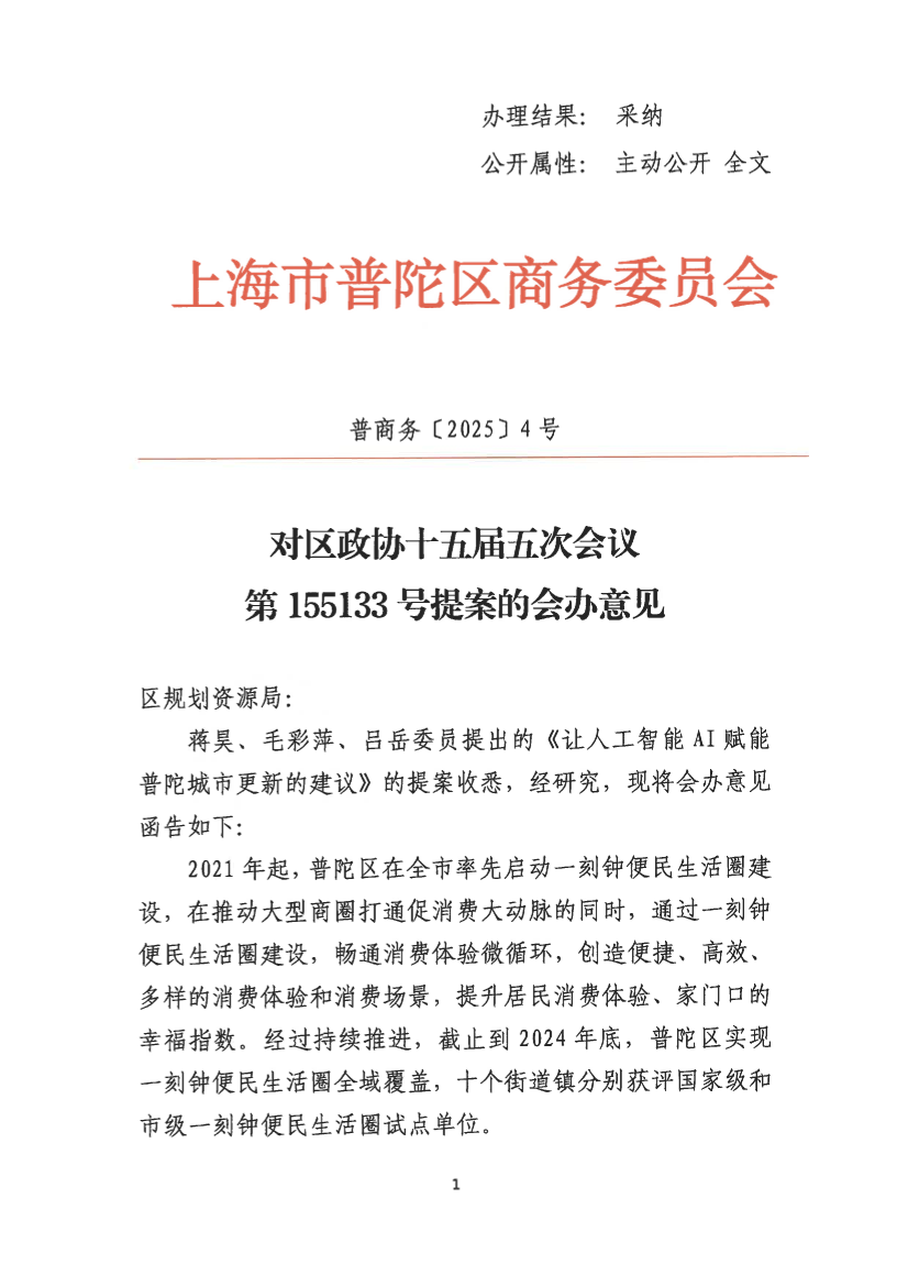 蒋昊、毛彩萍、吕岳委员提出的《让人工智能AI赋能普陀城市更新的建议》的提案收悉,经研究,现将会办意见函告如下: