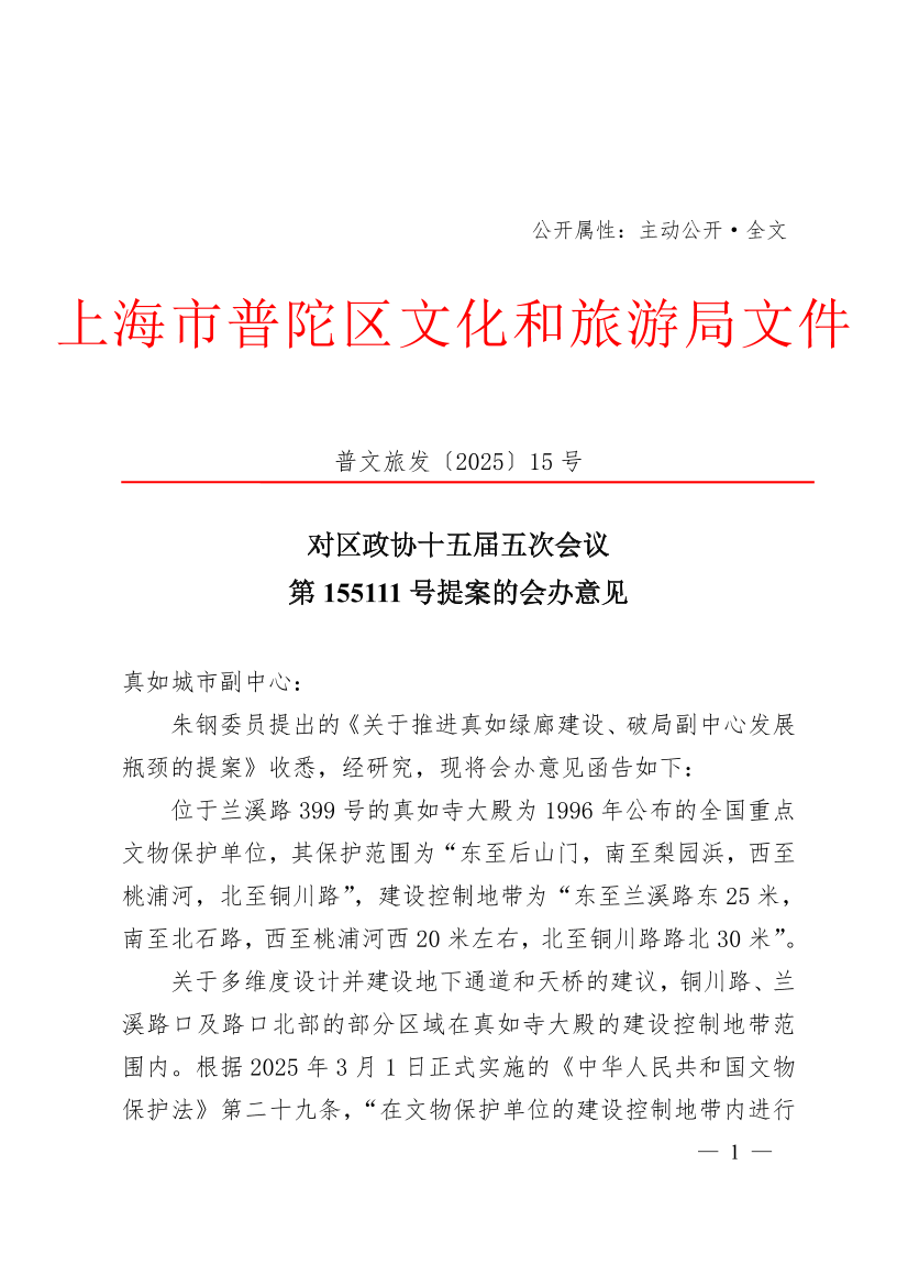 关于多维度设计并建设地下通道和天桥的建议,铜川路、兰溪路口及路口北部的部分区域在真如寺大殿的建设控制地带范围内。根据2025年3月1日正式实施的《中华人民共和国文物保护法》第二十九条,“在文物保护单位的建设控制地带内进行建设工程,不得破坏文物保护单位的历史风貌;工程设计方案应当根据文物保护单位的级别和建设工程对文物保护单位历史风貌的影响程度,经国家规定的文物行政部门同意后,依法取得建设工程规划许可”。涉及真如寺大殿建设控制地带的兰溪路及周边地区城市更新项目方案须报国家文物局批准,建议在该方案设计过程中,加强文物历史文化价值挖掘,提升街区整体风貌,呈现真如历史底蕴。区文物局将依职责配合做好报批工作,指导建设工程相关单位规范施工,确保文物安全。