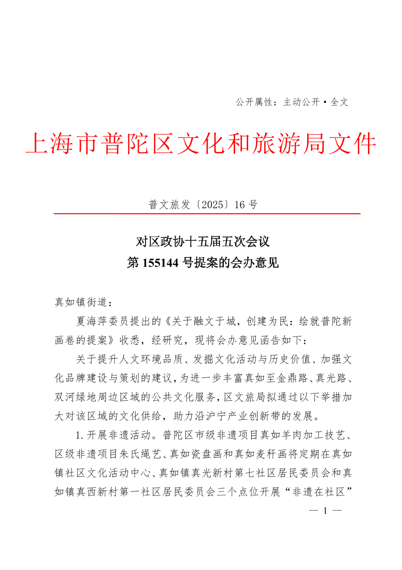 关于提升人文环境品质、发掘文化活动与历史价值、加强文化品牌建设与策划的建议,为进一步丰富真如至金鼎路、真光路、双河绿地周边区域的公共文化服务,区文旅局拟通过以下举措加大对该区域的文化供给,助力沿沪宁产业创新带的发展。