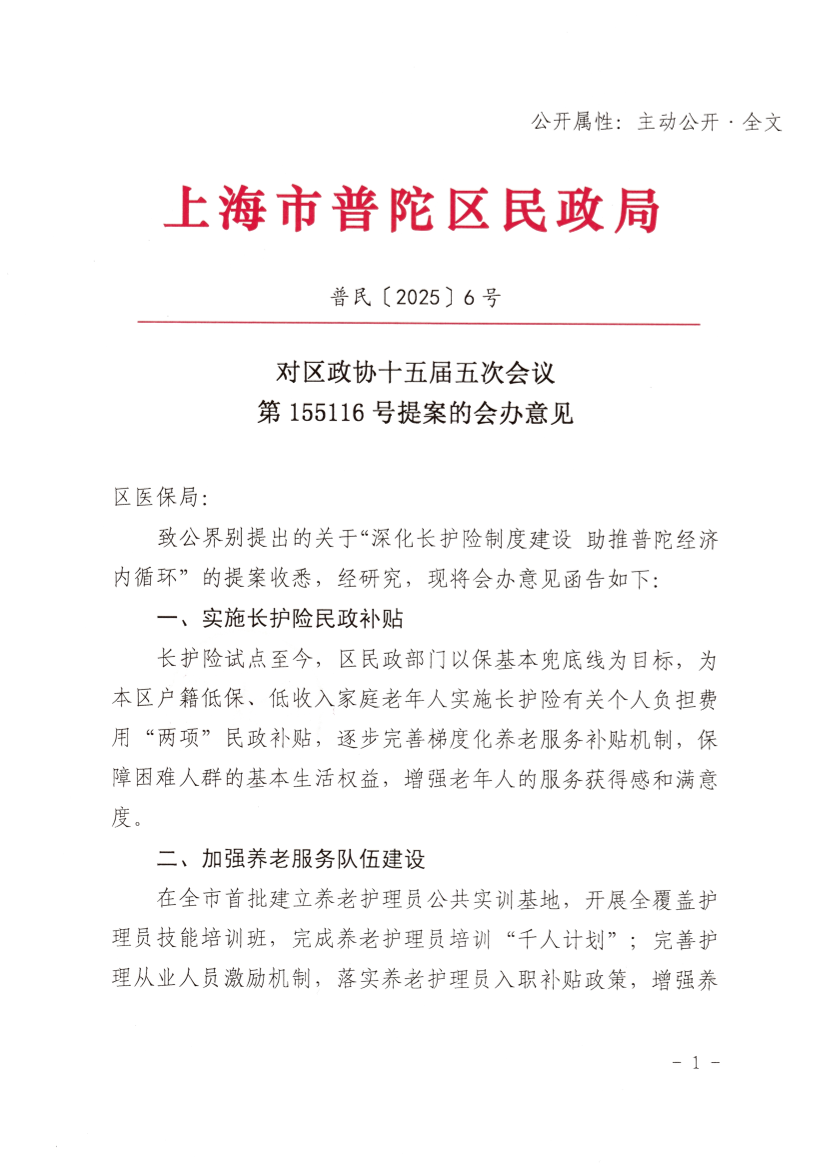 致公界别提出的关于“深化长护险制度建设 助推普陀经济内循环”的提案收悉,经研究,现将会办意见函告如下: