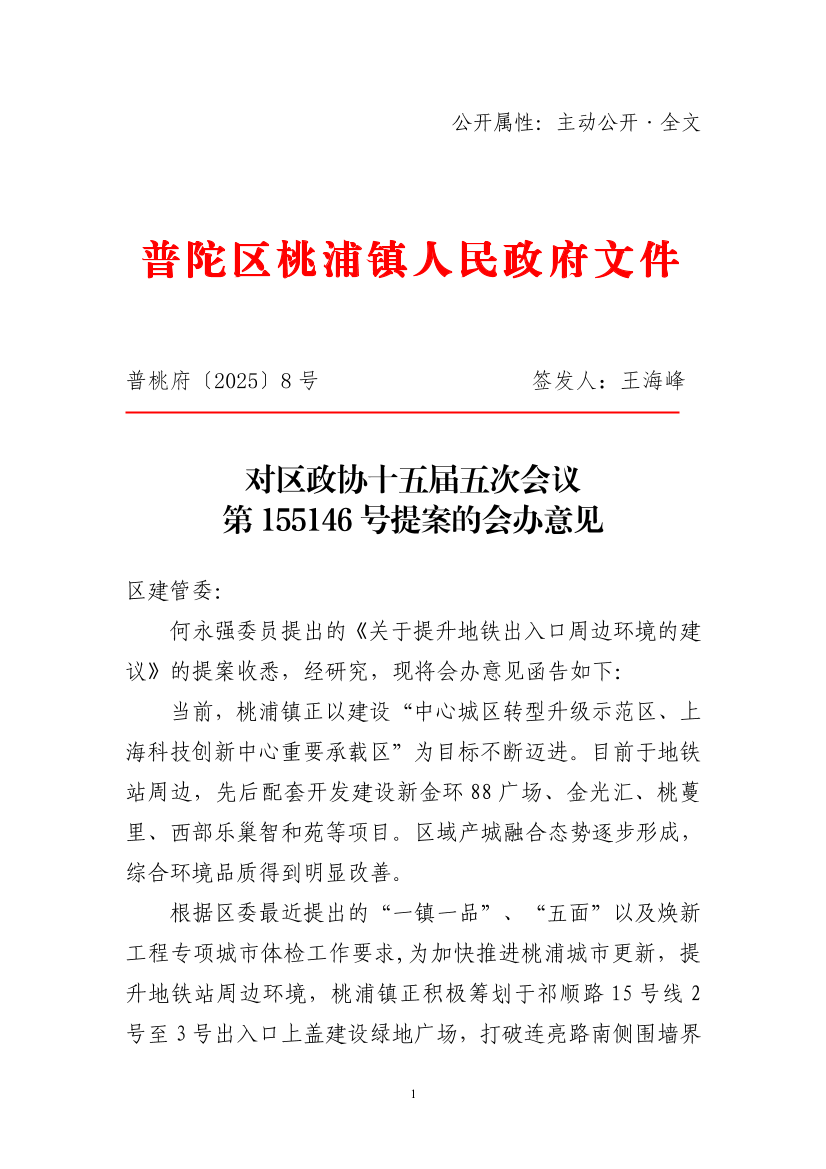 根据区委最近提出的“一镇一品”、“五面”以及焕新工程专项城市体检工作要求,为加快推进桃浦城市更新,提升地铁站周边环境,桃浦镇正积极筹划于祁顺路15号线2号至3号出入口上盖建设绿地广场,打破连亮路南侧围墙界限,融入儿童友好设施、活动休憩区及旱喷活动区,实现公共空间功能的全面焕新,以适配全龄段市民的多元化需求。同时,针对非机动车乱停放问题,我镇将联合区城投充分利用金光汇TOD商业综合体广场空地,进行科学规划与合理布局,确保非机动车停放安全有序,从而构建集休闲、娱乐、生态、交通等功能于一体的高品质城市公共空间,为周边居民带来更加便捷、舒适、优质的服务体验。