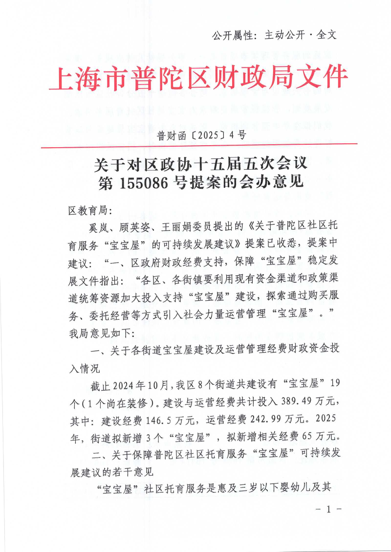 奚岚、顾英姿、王丽娟委员提出的《关于普陀区社区托育服务“宝宝屋”的可持续发展建议》提案已收悉,提案中建议:“一、区政府财政经费支持,保障“宝宝屋”稳定发展文件指出:“各区、各街镇要利用现有资金渠道和政策渠道统筹资源加大投入支持“宝宝屋”建设,探索通过购买服务、委托经营等方式引入社会力量运营管理“宝宝屋”。”我局意见如下: