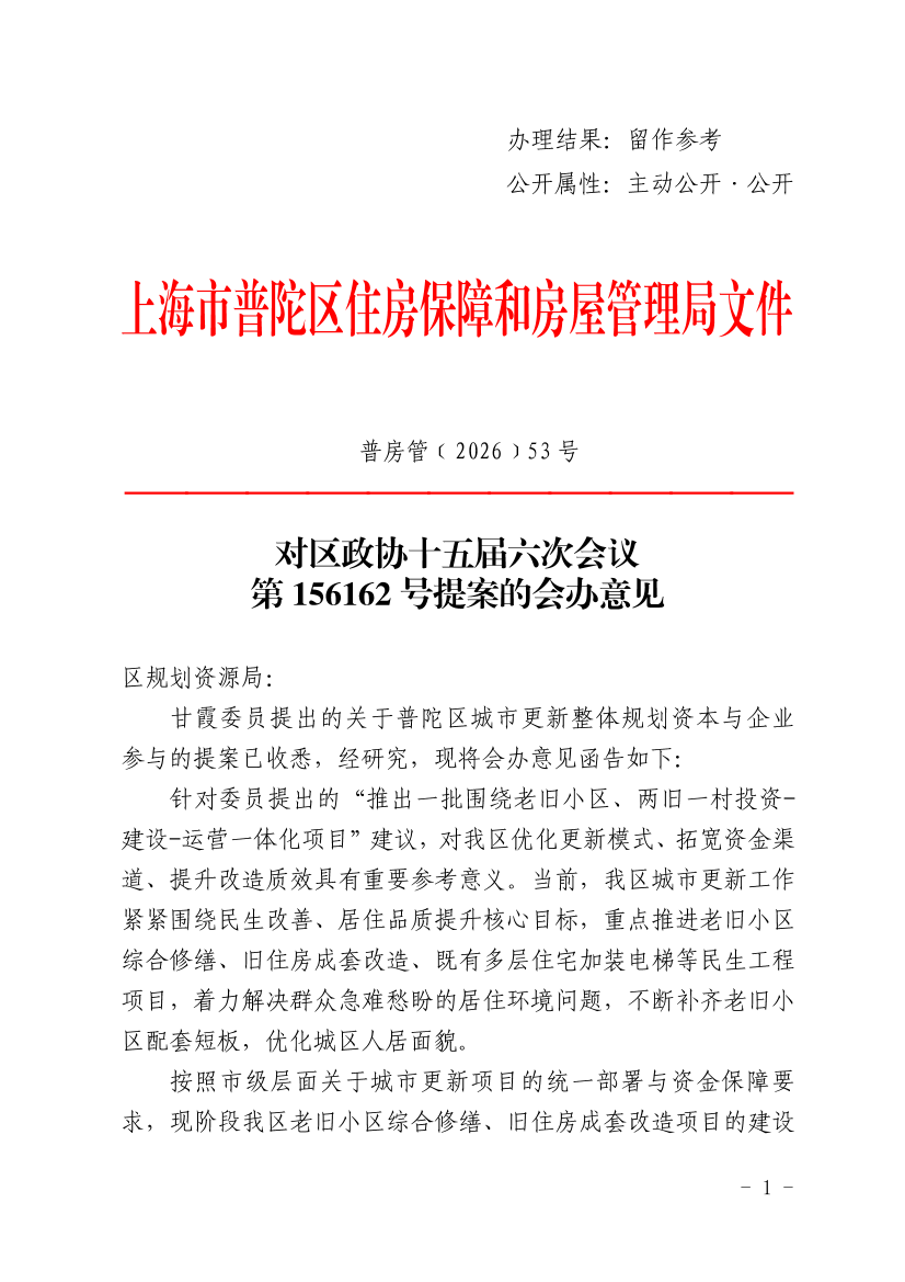 甘霞委员提出的关于普陀区城市更新整体规划资本与企业参与的提案已收悉,经研究,现将会办意见函告如下: