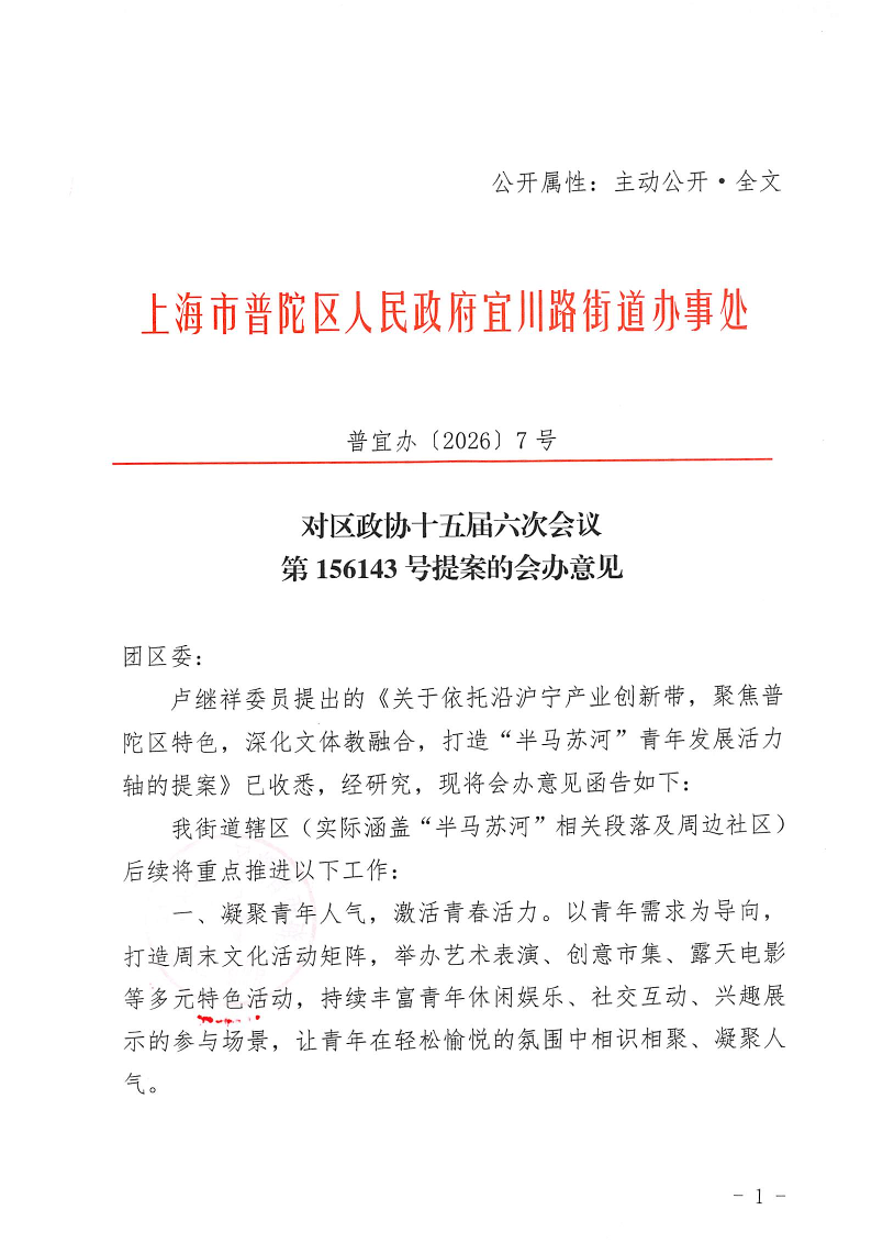卢继祥委员提出的《关于依托沿沪宁产业创新带,聚焦普陀区特色,深化文体教融合,打造“半马苏河”青年发展活力轴的提案》已收悉,经研究,现将会办意见函告如下:
