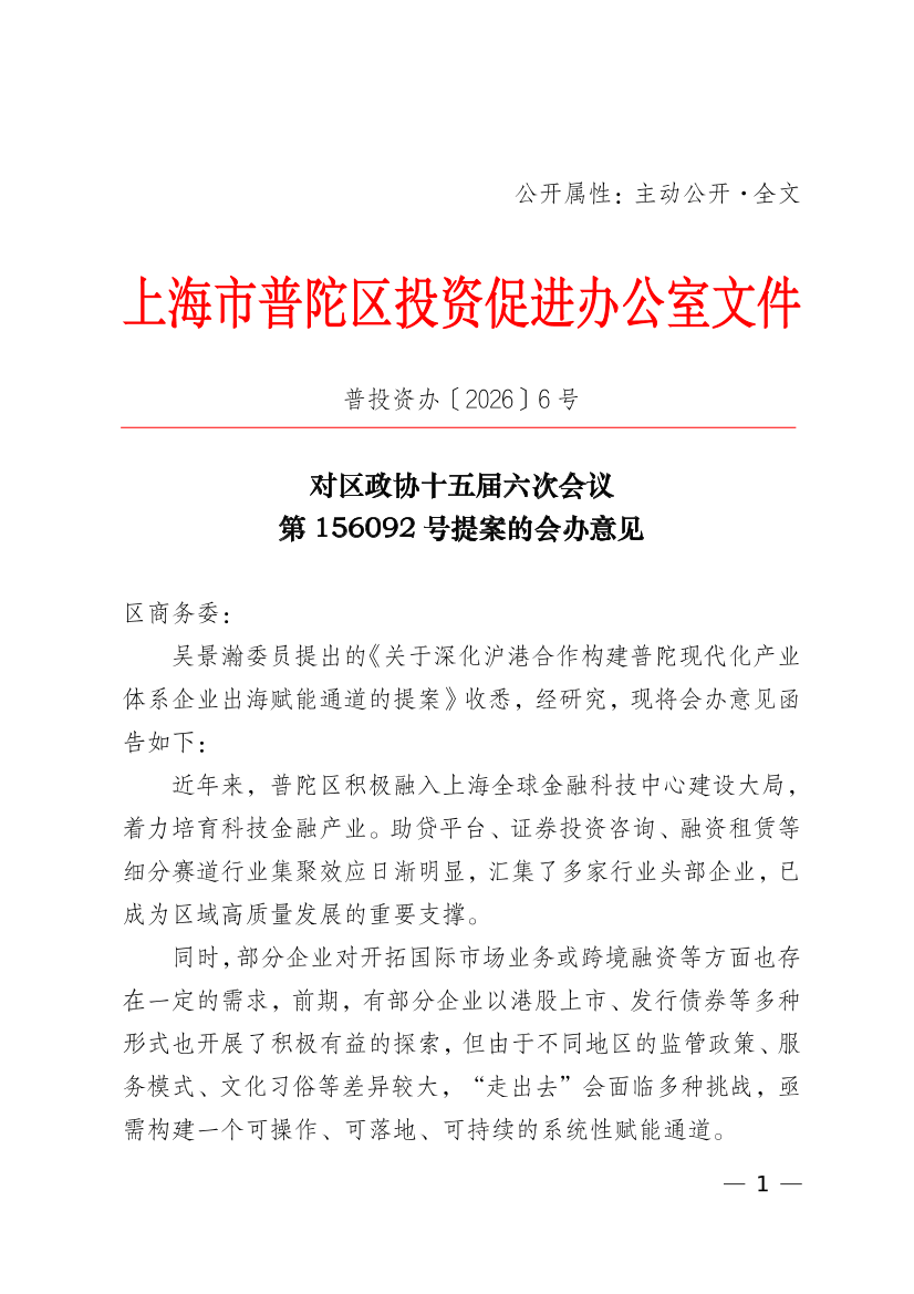 吴景瀚委员提出的《关于深化沪港合作构建普陀现代化产业体系企业出海赋能通道的提案》收悉,经研究,现将会办意见函告如下: