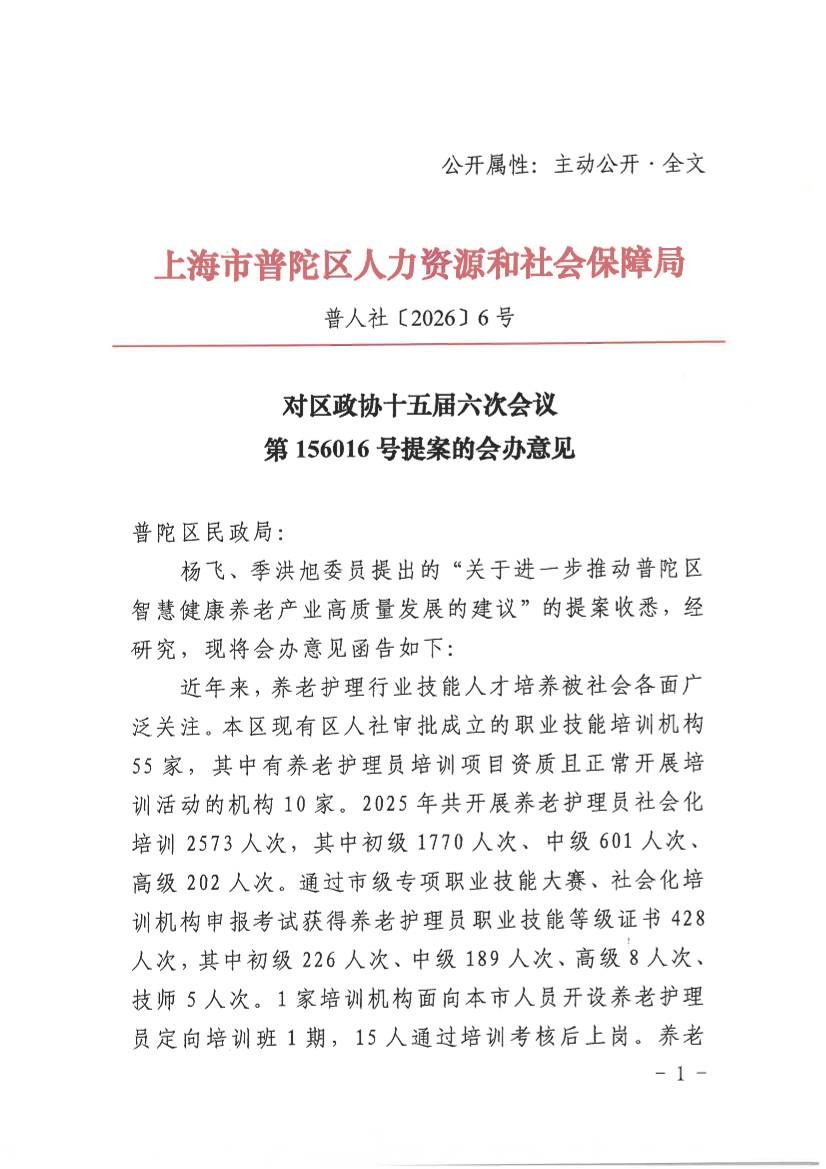 近年来,养老护理行业技能人才培养被社会各面广泛关注。本区现有区人社审批成立的职业技能培训机构55家,其中有养老护理员培训项目资质且正常开展培训活动的机构10家。2025年共开展养老护理员社会化培训2573人次,其中初级1770人次、中级601人次、高级202人次。通过市级专项职业技能大赛、社会化培训机构申报考试获得养老护理员职业技能等级证书428人次,其中初级226人次、中级189人次、高级8人次、技师5人次。1家培训机构面向本市人员开设养老护理员定向培训班1期,15人通过培训考核后上岗。养老护理行业技能人才规模和能级正在不断提升。针对委员提出的“智慧养老需‘懂养老服务+懂信息技术’的复合型人才”“围绕护理员、社区工作人员、企业运维人员等岗位开展专业培训”等问题建议,结合市区职业技能培训评价实际,我们建议可以从以下三方面着手,以技能人才培育推动普陀区智慧健康养老产业高质量发展。