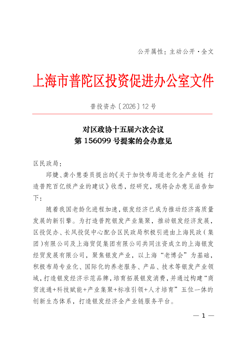 邱婕、龚小慧委员提出的《关于加快布局适老化全产业链 打造普陀百亿级产业的建议》收悉,经研究,现将会办意见函告如下: