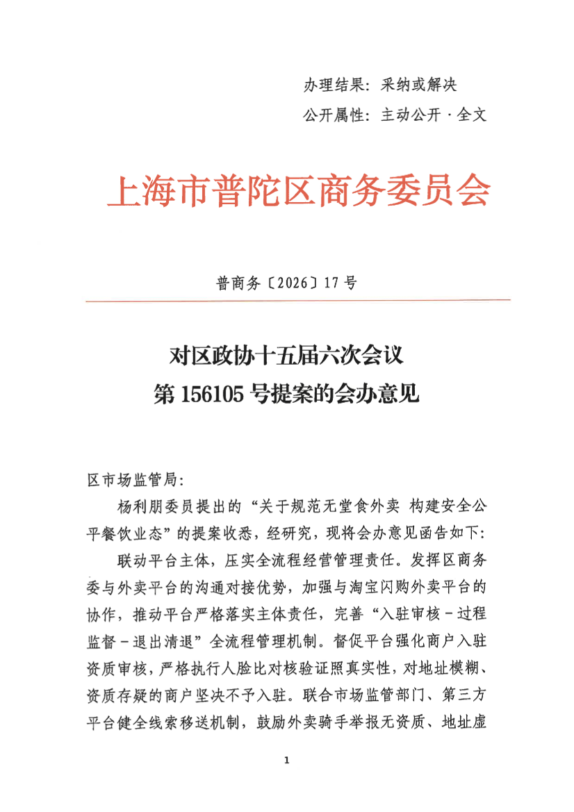 杨利朋、葛蔓委员提出的关于《关于规范无堂食外卖 构建安全公平餐饮业态》的提案收悉,经研究,现将会办意见函告如下: 结合我区无堂食外卖“数量多、分布杂、选址隐蔽”以及“微型厨房”火灾荷载密度高等实际现状,我单位将积极配合,共同推动无堂食外卖业态在安全规范的轨道上健康发展,既回应民生关切,又兼顾商户实际运营成本,努力实现”监管有力度、发展有温度”的治理目标。 一、厨房定期清洗 我区核心商圈集中点“微型厨房”占比高,油烟净化设备不达标、管道清洗不及时是导致环保投诉与火灾隐患的突出问题。 建议:一是结合日常监管,将油烟净化设施清洗频次和台账记录作为无堂食外卖厨房的必查项,督促商户委托专业机构定期清洗,留存记录。二是针对商住混合、背街小巷等隐蔽点位,可依托街道网格员力量进行协查,对长期未清洗、油污积聚严重的点位,及时通报消防部门联合处置。 二、加装厨房灭火系统、独立烟感、报警器 无堂食外卖厨房多藏匿于居民楼底层或商住混合楼宇,一旦起火,对公共安全威胁极大,基础消防设施配备不可或缺。 建议:一是针对现有存量商户,鼓励其以低成本方式先行配备独立烟感报警器和灭火毯,实现“早预警、早处置”。二是对于投诉集中、风险较高的“微型厨房”聚集区,可引导或要求其逐步加装简易喷淋或厨房专用灭火系统,通过技术手段降低火灾荷载密度带来的风险。 三、落实员工培训上岗、定期演练、了解掌握“三关一闭” 从业人员流动性大、安全意识薄弱,是“人盯店”模式失效的重要原因之一。 建议:一是强化岗前基本技能培训,要求商户将“三关一闭”(关火、关电、关气,闭门窗)作为每日收班的硬性规定,建立自查打卡制度。二是依托街道或物业,定期组织微型厨房集中的区域开展小范围、实战化的消防演练,让员工掌握初期火灾扑救和逃生技能,避免培训流于形式。 以上意见供你单位统一答复提案者时参考。