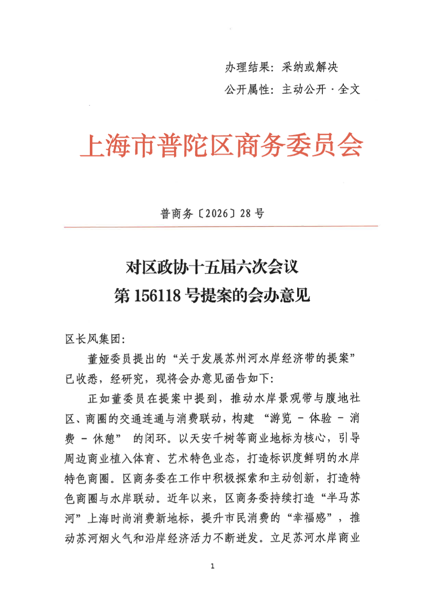 正如董委员在提案中提到,推动水岸景观带与腹地社区、商圈的交通连通与消费联动,构建 “游览 - 体验 - 消费 - 休憩” 的闭环。以天安千树等商业地标为核心,引导周边商业植入体育、艺术特色业态,打造标识度鲜明的水岸特色商圈。区商务委在工作中积极探索和主动创新,打造特色商圈与水岸联动。近年以来,区商务委持续打造“半马苏河”上海时尚消费新地标,提升市民消费的“幸福感”,推动苏河烟火气和沿岸经济活力不断迸发。立足苏河水岸商业设施和沿岸文旅资源,探索文商旅体展联动的消费新模式,打造上海滨河特色消费新地标,构建绿色、开放、户外、休闲相互融合的消费新空间,开创居民品质生活的消费新场景,形成上海最具特色的水岸经济活力带。2026年,区商务委将围绕“新场景、新模式、新业态”的三新消费和服务消费提质扩容,推动苏州河滨水商业迸发更大活力。