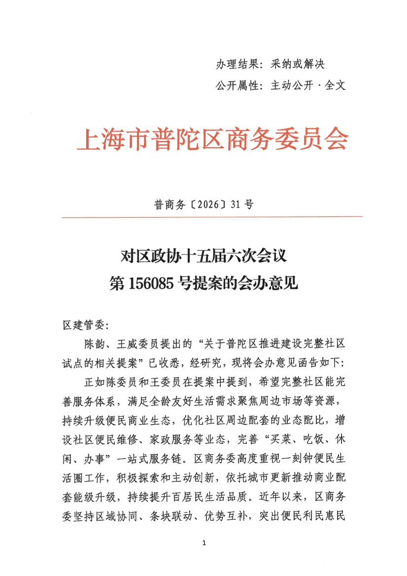 陈韵、王威委员提出的“关于普陀区推进建设完整社区试点的相关提案”已收悉,经研究,现将会办意见函告如下: