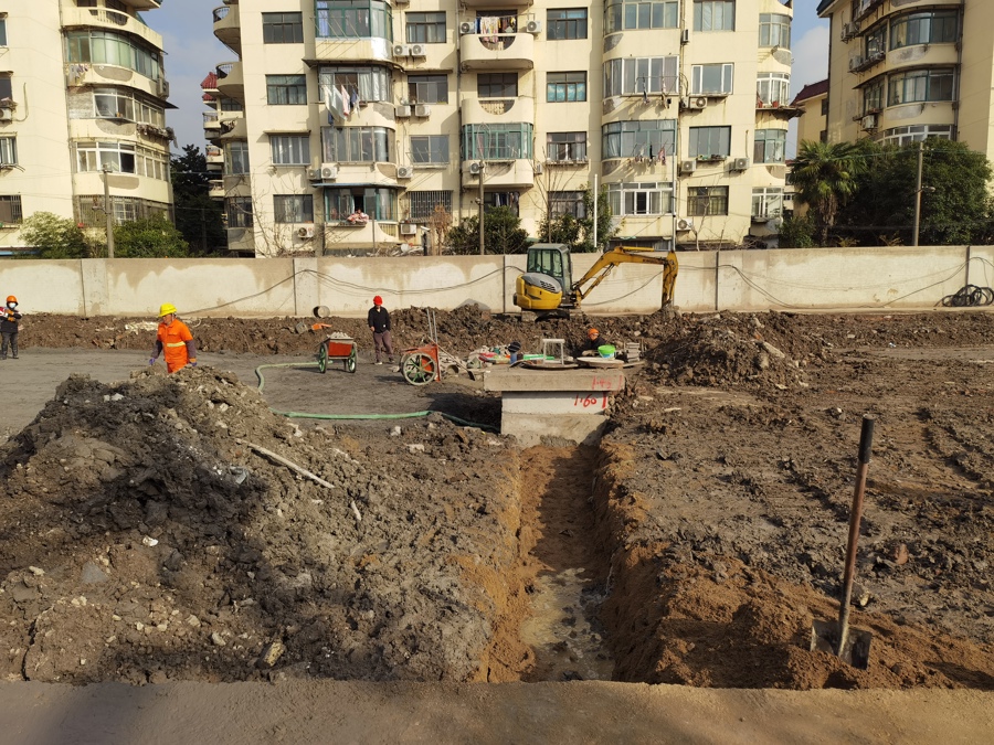 道路中间,几名工人正在挖出来的沟槽里忙碌。施工人员介绍,他们正在加班加点,对道路管线的施工进行收尾。