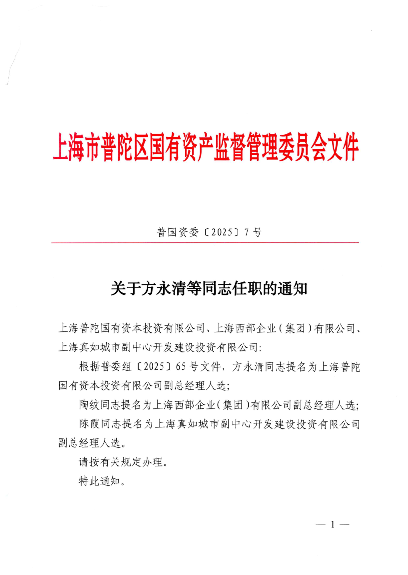 根据普委组〔2025〕65号文件,方永清同志提名为上海普陀国有资本投资有限公司副总经理人选;