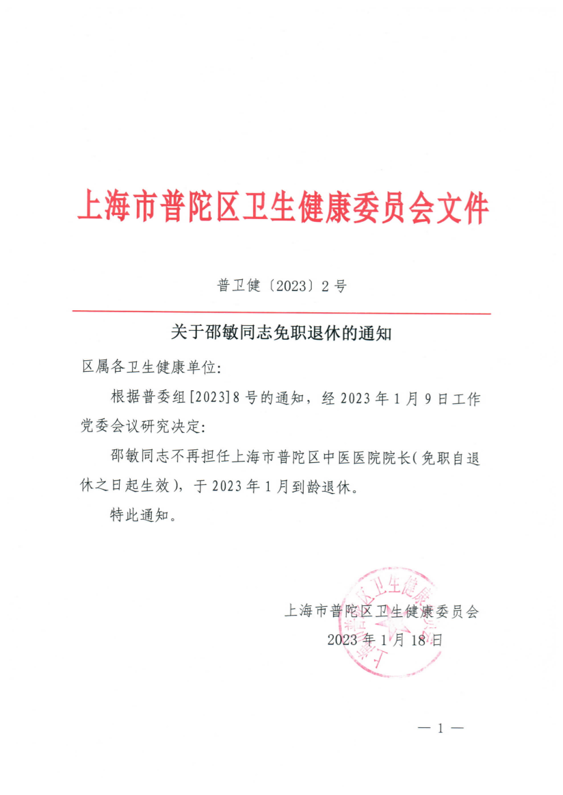 邵敏同志不再担任上海市普陀区中医医院院长(免职自退休之日起生效),于2023年1月到龄退休。