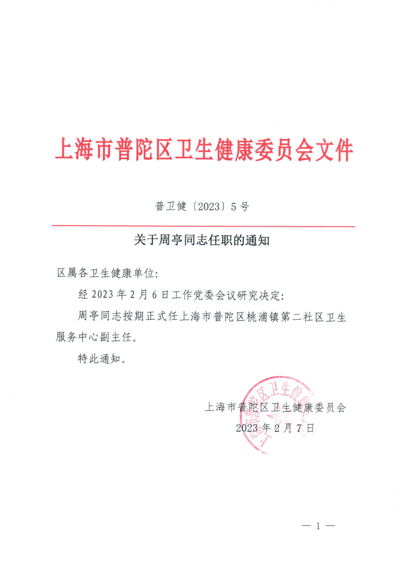 周亭同志按期正式任上海市普陀区桃浦镇第二社区卫生服务中心副主任。