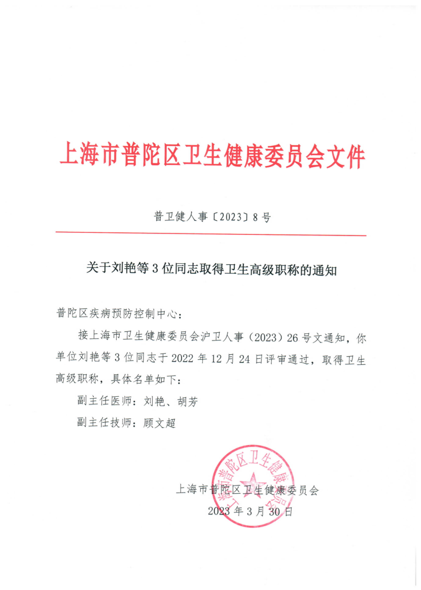 接上海市卫生健康委员会沪卫人事(2023)26号文通知,你单位刘艳等3位同志于2022年12月24日评审通过,取得卫生高级职称,具体名单如下: