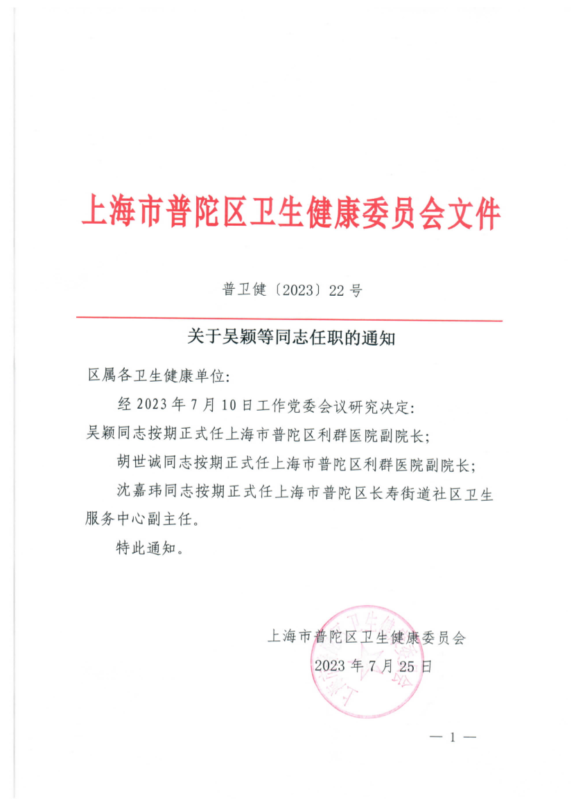 沈嘉玮同志按期正式任上海市普陀区长寿街道社区卫生服务中心副主任。