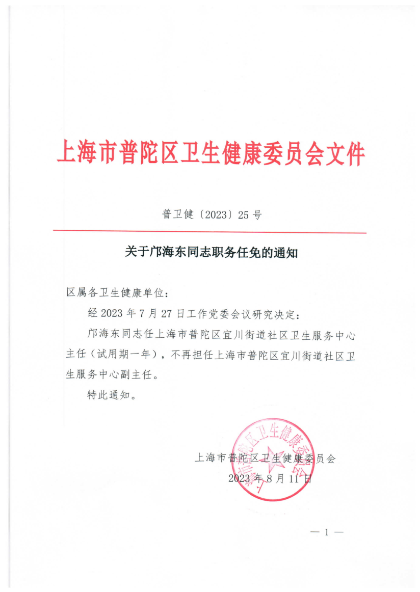 邝海东同志任上海市普陀区宜川街道社区卫生服务中心主任(试用期一年),不再担任上海市普陀区宜川街道社区卫生服务中心副主任。
