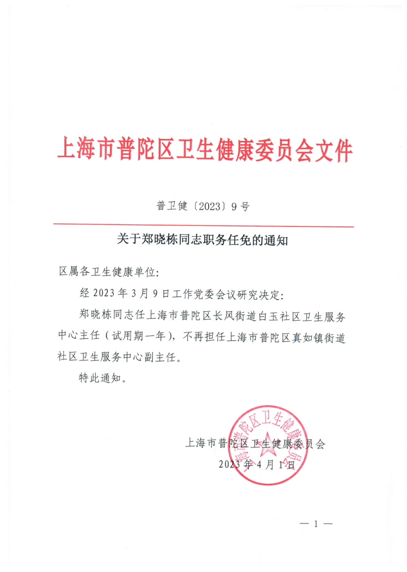 郑晓栋同志任上海市普陀区长风街道白玉社区卫生服务中心主任(试用期一年),不再担任上海市普陀区真如镇街道社区卫生服务中心副主任。