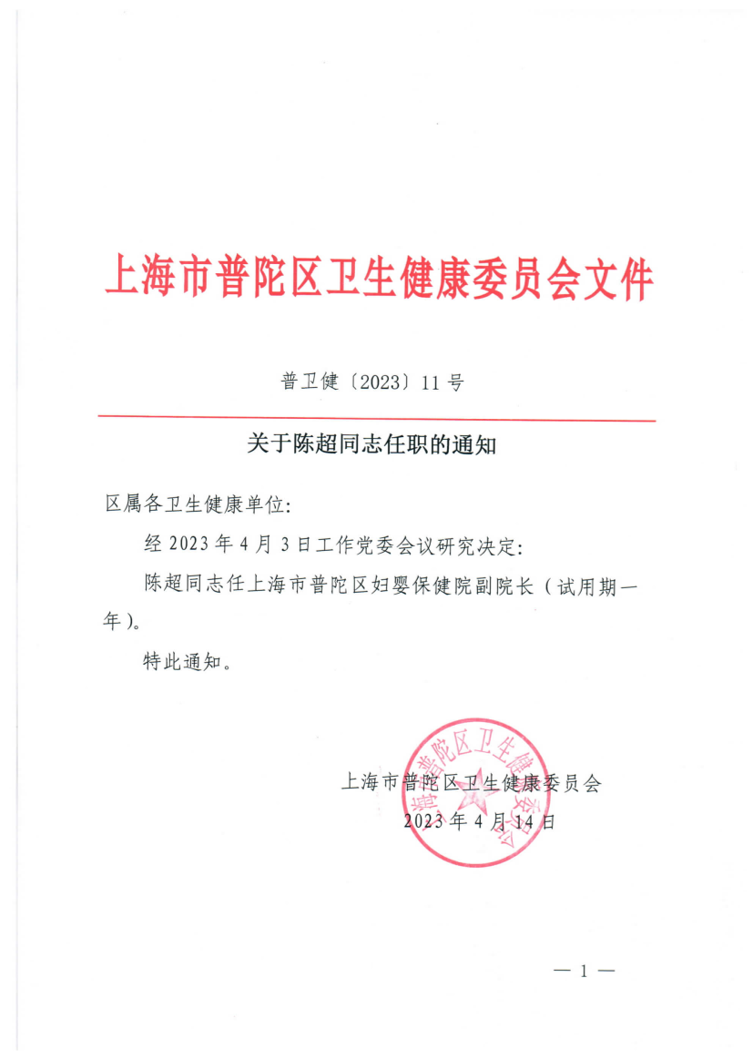 陈超同志任上海市普陀区妇婴保健院副院长(试用期一年)。