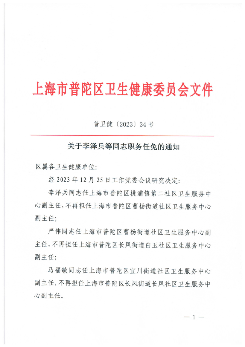 李泽兵同志任上海市普陀区桃浦镇第二社区卫生服务中心副主任,不再担任上海市普陀区曹杨街道社区卫生服务中心副主任;