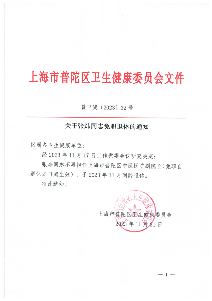 张炜同志不再担任上海市普陀区中医医院副院长(免职自退休之日起生效),于2023年11月到龄退休。