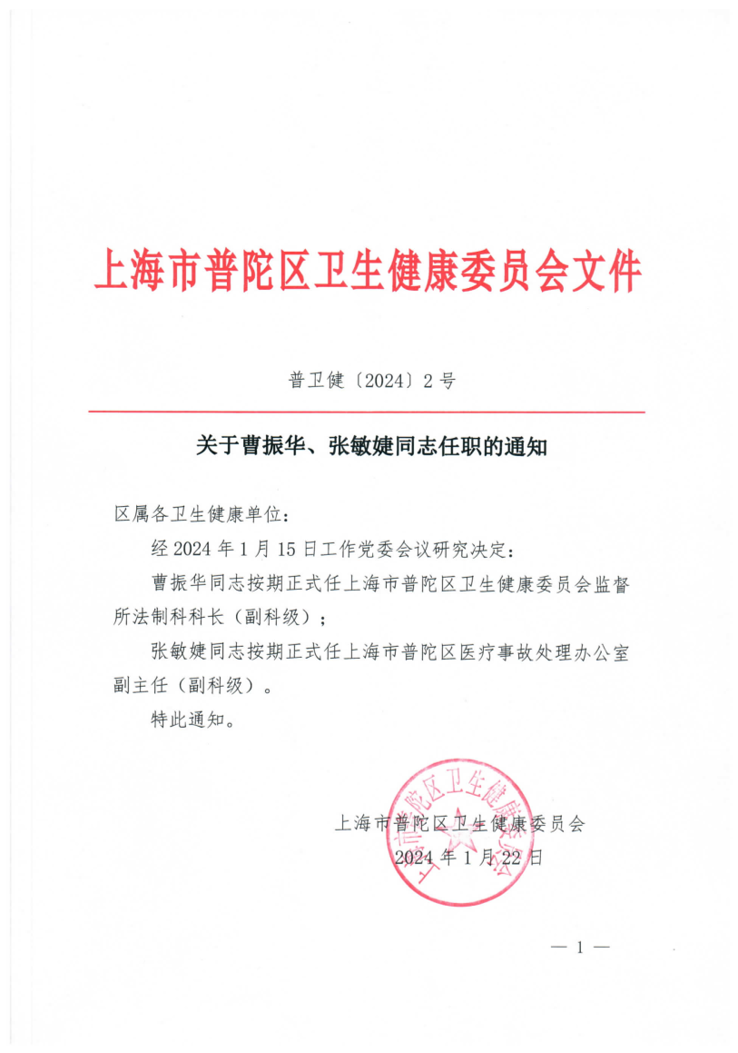 曹振华同志按期正式任上海市普陀区卫生健康委员会监督所法制科科长(副科级);