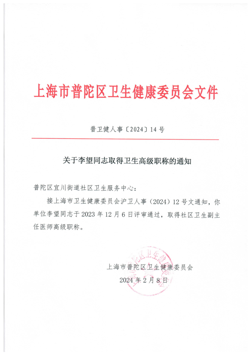 接上海市卫生健康委员会沪卫人事(2024)12号文通知,你单位李望同志于2023年12月6日评审通过,取得社区卫生副主任医师高级职称。