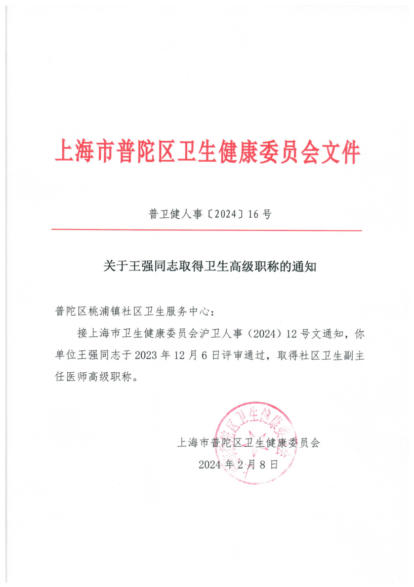 接上海市卫生健康委员会沪卫人事(2024)12号文通知,你单位王强同志于2023年12月6日评审通过,取得社区卫生副主任医师高级职称。