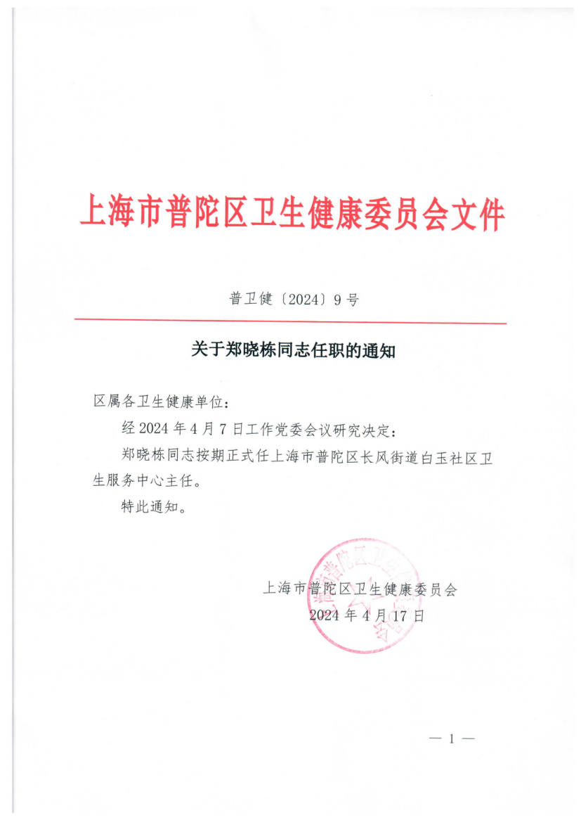 郑晓栋同志按期正式任上海市普陀区长风街道白玉社区卫生服务中心主任。
