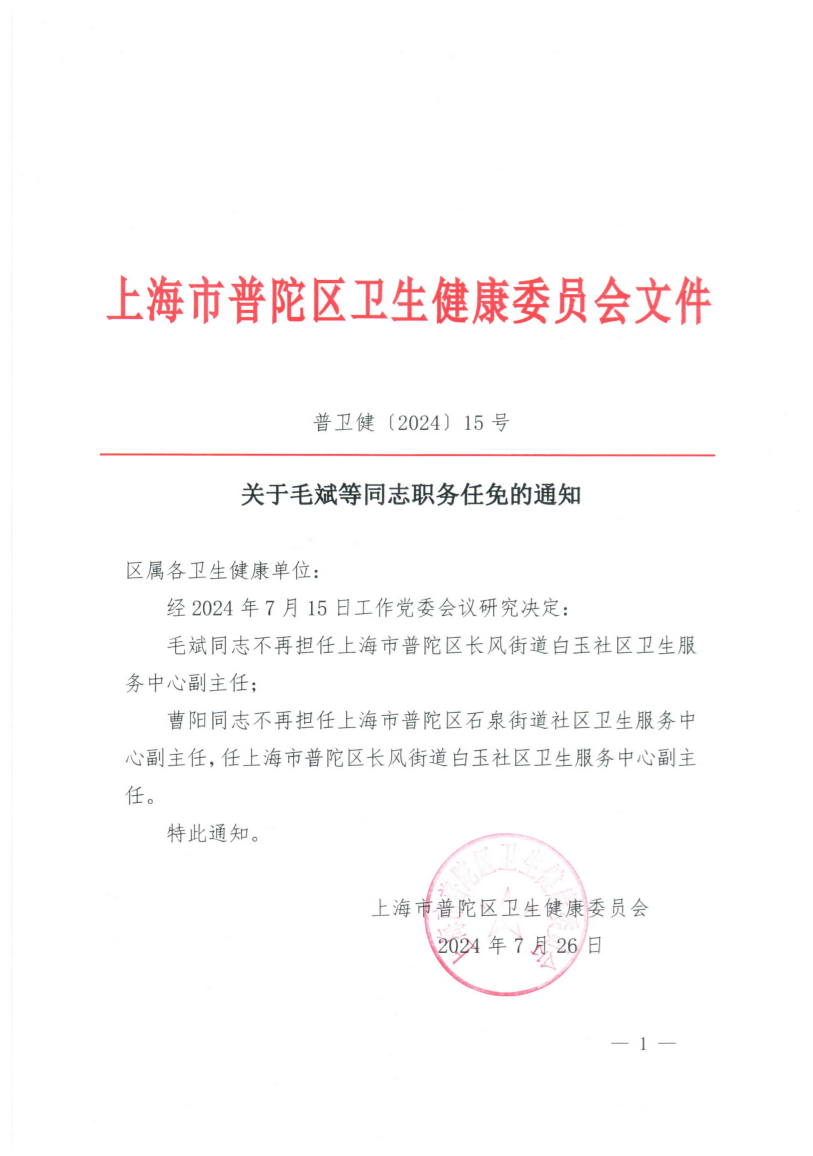毛斌同志不再担任上海市普陀区长风街道白玉社区卫生服务中心副主任;