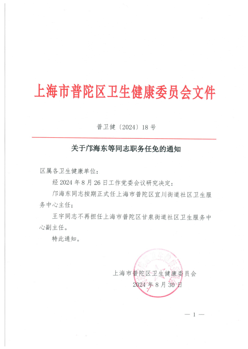 邝海东同志按期正式任上海市普陀区宜川街道社区卫生服务中心主任;