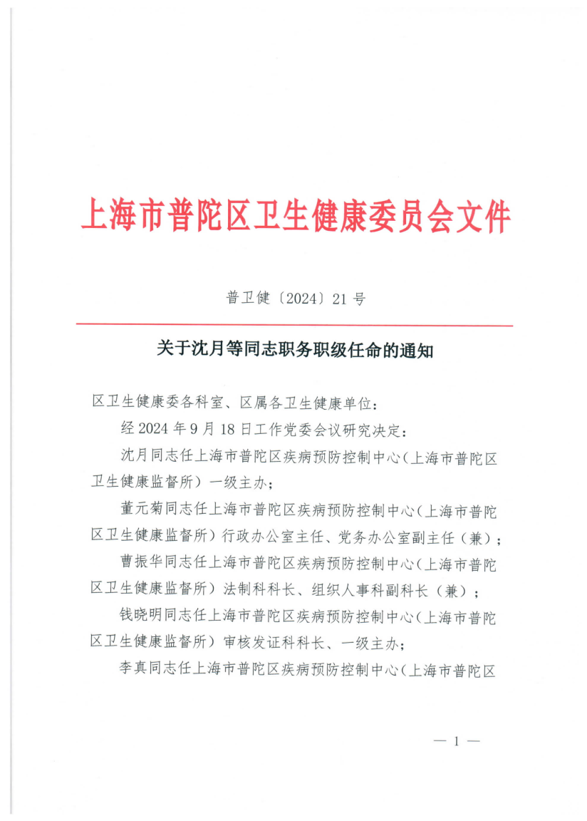 沈月同志任上海市普陀区疾病预防控制中心(上海市普陀区卫生健康监督所)一级主办;
